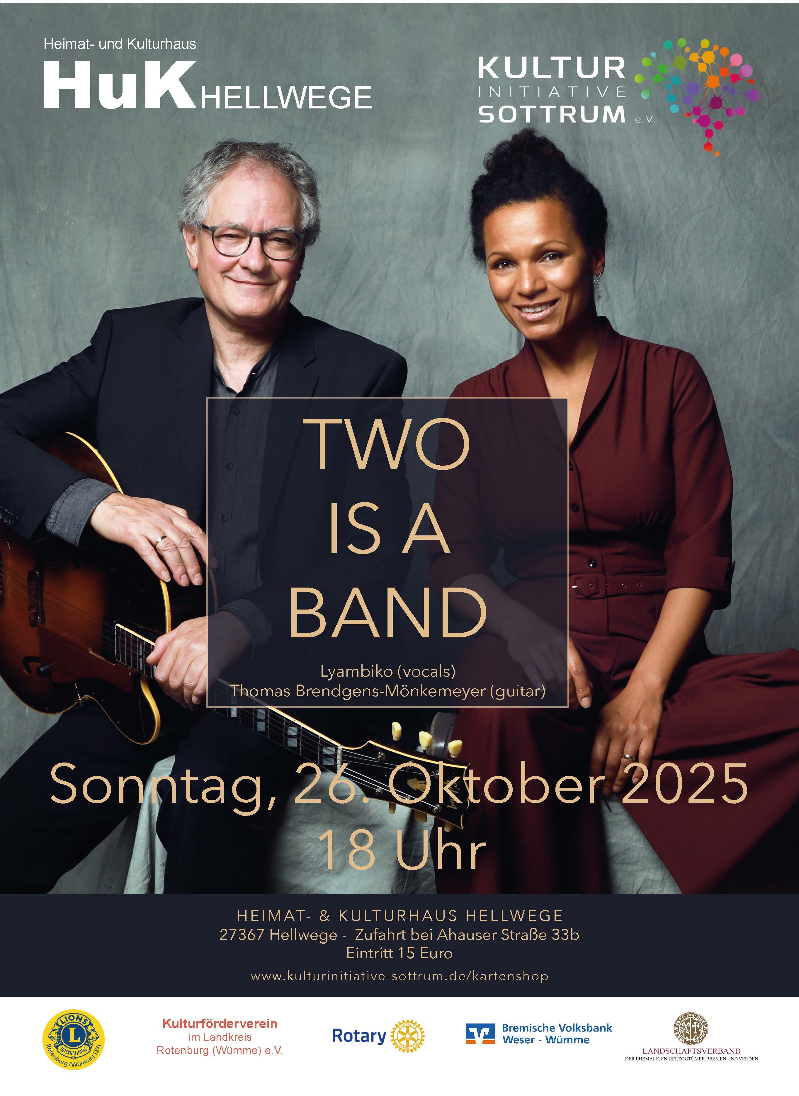 Two is a Band – so einfach lässt sich das Projekt von Jazzsängerin Lyambiko und Gitarrist Thomas Brendgens-Mönkemeyer benennen. Begegnet sind sich die beiden erstmals 2018 während der Studioaufnahmen für Lyambikos Weihnachtsalbum „My Favourite Christmas Songs“. Nachdem der Funke vom ersten gemeinsam gespielten Stück an gleich übersprang und sie sich musikalisch sofort verstanden, setzen sie ihre Zusammenarbeit fort.